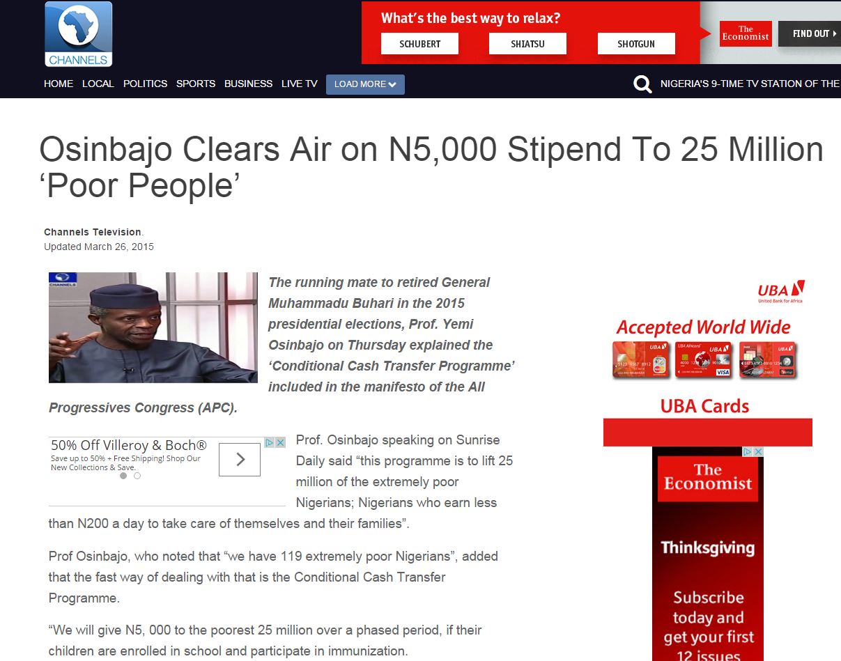 N1.5 Trillion is what you get when you multiply N5,000 by 25 million people for 12 months. This is 25% of our proposed N6 Trillion 2016 budget. The US will spend 9.8% of her 2016 budget on welfare. They have a poverty rate of 15% of their population. This translates to a family of 3 living on less than $18, 550 per annum.